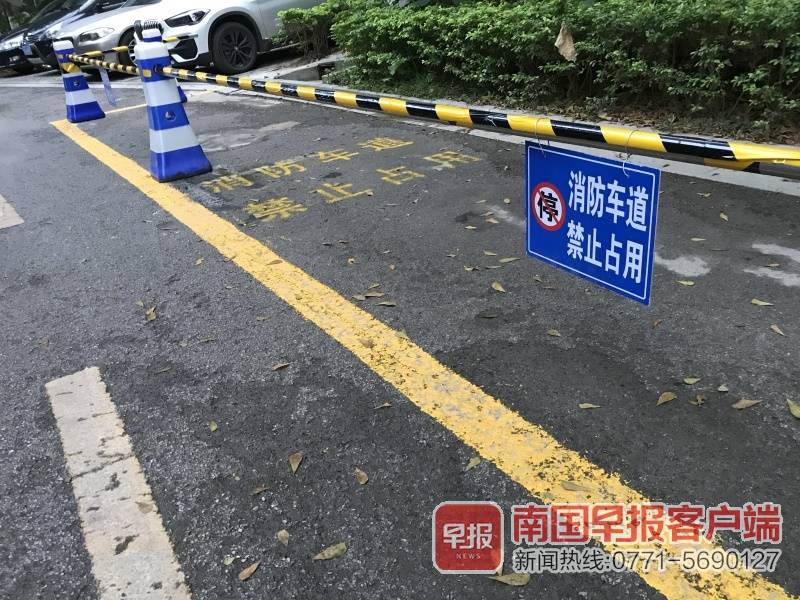 ▲南宁一小区近期将消防通道上原有停车位撤除,并设置相关标志。罗暘/摄
