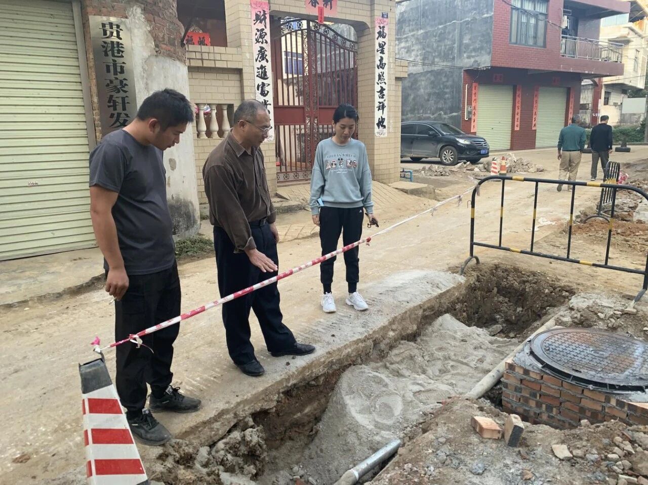 贵港市、港南区人大代表,江南街道航运社区党支部书记、居委会主任麦夏子(右一)积极推进社区排污管道修缮工作,与城管部门到现场确定排污管道开挖位置